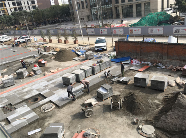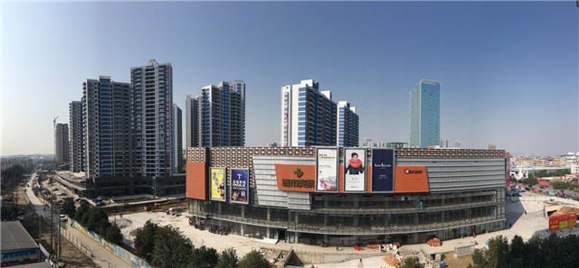 7、室外附屬:居然之家主入口室外附屬全部完成;時尚百貨及弘光路一側廣場大面積石材鋪貼完成,8#、9#樓一側室外石材鋪裝大面積完成。居然之家四層屋面鋪裝及綠化施工完畢。A、B區(qū)中間市政道路正在埋管施工中。